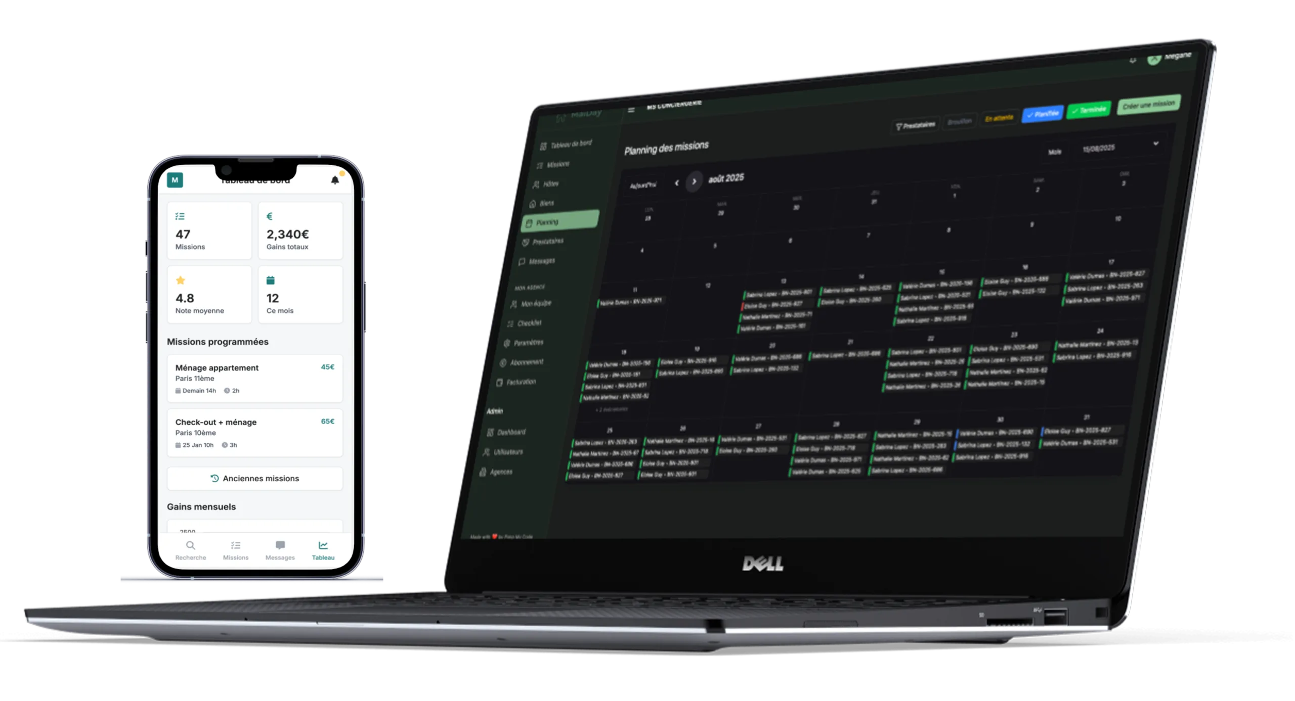 MaiDay est une solution complète (web & mobile) qui centralise la gestion du ménage, de la mission à la facturation.