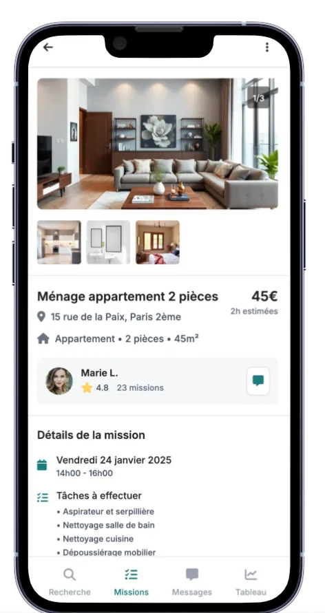 Avec MaiDay, accédez gratuitement à des missions de ménage autour de vous, choisissez celles qui vous conviennent et gérez votre planning en toute autonomie.
